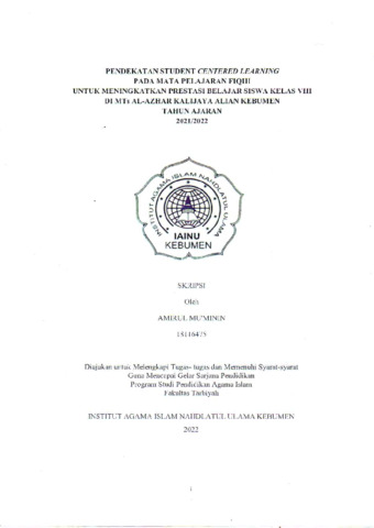 Amirul Mu’minin, NIM. 18116475 and Imam Subarkah, M.Pd., NIDN. 2129078202 and Fibriyan Irodati, M.Pd.I., NIDN. 2120029101 (2022) Pendekatan Student Centered Learning (SCL) pada Mata Pelajaran Fiqih untuk Meningkatkan Prestasi Belajar Siswa Kelas VIII A Di Mts Al-Azhar Kalijaya Alian Kebumen Tahun Ajaran 2021/2022. Other thesis, Institut Agama Islam Nahdlatul Ulama ( IAINU Kebumen).
