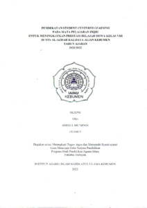 Tujuan Penelitian adalah: (1) Untuk mengetahui penerapan Pendekatan Student Centered Learning pada mata pelajaran Fiqih kelas VIII di MTs Al�Azhar Kalijaya, (2) Untuk mengetahui hasil belajar mata pelajaran Fiqih kelas VIII menggunakan Pendekatan Student Centered Learning di MTs Al- Azhar Kalijaya, (3) Untuk mengetahui apakah melalui Pendekatan Student Centered Learning mampu meningkatkan prestasi belajar siswa pada mata pelajaran Fiqih kelas VIII di Mts Al-Azhar Kalijaya. Penelitian ini berupa Penelitian Tindakan Kelas (PTK). Siswa yang diteliti adalah siswa kelas VIII A Mts Al-Azhar Kalijaya sejumlah 30 siswa. Data yang dikumpulkan berupa data pelaksanaan pembelajaran yang menggunakan pendekatan SCL dan hasil belajar. Analisis data yang digunakan adalah analisis data kualitatif dan kualitatif. Teknik analisis data yang digunakan adalah reduksi data, penyajian data dan penarikan simpulan. Berdasarkan hasil penelitian dapat disimpulkan bahwa : (1) Pelaksanaan pendekatan Student Centered Learning pada pembelajaran fikih telah dilaksanakan dengan baik sesuai prosedur : (a) Hasil observasi guru pada siklus I 64,44% dan hasil observasi siswa 46,66. (b) Hasil observasi pada siklus II mengalami kenaikan yaitu menjadi 84,88 dan hasil observasi siswa 75,55. (2) Penerapan Pendekatan Student Centered Learning secara umum dapat meningkatkan hasil belajar siswa dengan hasil : (a) Nilai rata-rata siswa yang semula 67,33 meningkat pada siklus I menjadi 72,66 dan pada siklus II menjadi 80. (b) ketuntasan belajar siswa juga meningkat yang dimulai dari siklus I 53,33%, dan siklus II naik menjadi 76,66%, Siswa yang hasil belajarnya belum tuntas adalah delapan siswa atau 26,66% disebabkan kesulitan dalam menjawab soal. (3) iya, melalui penerapan Pendekatan Student Centered Learning mampu meningkatkan Hasil Prestasi Belajar Siswa ditandai dengan perbandingan dalam peningkatan hasilnya melalui antar siklus : (a) Prasiklus 36,66%, (b) siklus I 53,33%, (c) Siklus II 76,66%.