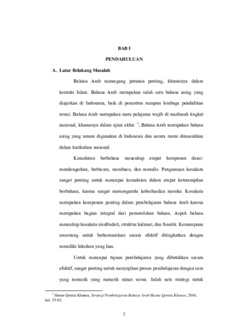 kosakata bahasa Arab siswa kelas IV di MI Muhammadiyah Klopogodo. Penelitian ini menggunakan pendekatan Kualitatif. Informan dalam penelitian ini adalah kepala sekolah, guru mata pelajaran bahasa arab, dan siswa di MI Muhammadiyah Klopogodo. Teknik pengumpulan data yang digunakan