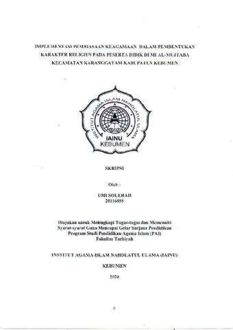 Umi Solehah, NIM. 20116855 and Oky Ristya Trisnawati, M.Pd., NIDN. 2106109102 (2024) Implementasi Pembiasaan Keagamaan Dalam Pembentukan Karakter Religius Pada Peserta Didik Di MI Al-Mujtaba Kec.Karanggayam Kab. Kebumen. Other thesis, Institut Agama Islam Nahdlatul Ulama ( IAINU Kebumen).