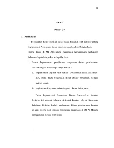 Tujuan penelitian adalah : (1) Untuk mengetahui bagaimana implementasi pembentukan karakter religius peserta didik di MI Al-Mujtaba Kec Karanggayam ? (2) Untuk mengetahui apa saja faktor pendukung dan penghambat dalam pembiasaan keagamaan terkait pembentukan karakter religius peserta didik?Penelitian ini menggunakan Pendekatan Kualitatif. Informan dalam penelitian ini adalah Kepala Madrasah, Guru PAI, Guru Kelas 1,2,3, Peserta Didik, Orangtua Peserta Didik. Teknik pengumpulan data penelitian ini menggunakan wawancara, observasi dan dokumentasi. Teknik analisis data yang terdiri dari 3 tahapan yaitu : (1) Reduksi Data; (2) Penyajian Data; (3) Penarikan Kesimpulan. Berdasarkan hasil kesimpulan penelitian dapat disimpulkan bahwa : (1) Bentuk kegiatan pembiasaan keagamaan dalam pembentukan karakter religius diantaranya :beruap kegiatan harian dan kegiatan mingguan. Kegiatan rutin harian : Doa asmaul husna, doa sehari-hari, sholat dhuha berjamaah, sholat dhuhur berjamaah, mengaji metode ummi sedangkan Kegiatan rutin mingguan : jumat dzikir jamai, jumat bersholawat. (2) Faktor pendukung dan penghamba Faktor pendukung dalam kegiatan pembiasaan keagamaan dalam pembentukan karakter religius pada peserta didik adalah adanya sarana prasana yaitu Mushola, Meja ummi, alat peraga ummi, buku ummi, pelatihan guru dalam mengaji ummi, adanya kerjasama antara pihak sekolah dengan orangtua. Selalu disiplin dalam pembiasaan. Faktor penghmbat dalam pembiasaam keagamaan dalam pembentukan karater religius pada peserta didik di MI terutama pada diri sendiri, faktor teman, keluarga, ruangan untuk doa bersama.
