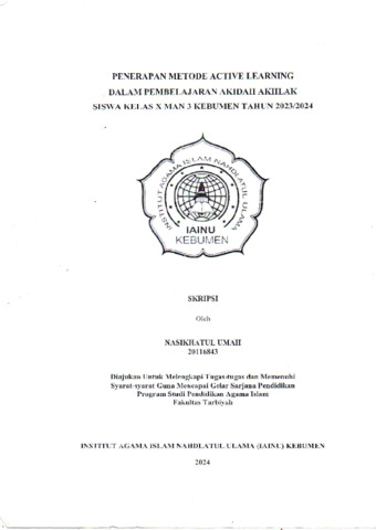 Nasikhatul Umah, NIM. 29116843 and Nadia Raifah Nawa Kartika, M.Pd., NIDN. 2122019103 (2024) Penerapan Metode Active Learning dalam Pembeajaran Akidah Akhlak Siswa Kelas X Man 3 Kebumen. Other thesis, Institut Agama Islam Nahdlatul Ulama ( IAINU Kebumen).