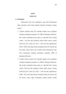 1. Variabel sertifikasi halal (X1) memiliki dampak secara signifikan terhadap peningkatan penjualan (Y) UMK di Kabupaten Kebumen. Hal tersebut disebabkan karena pada uji t diperoleh hasil t hitung sebesar 3,012 dan nilai signifikasi sebesar 0,004, karena t hitung lebih besar dari t tabel atau 3.012 > 1,991 dan nilai signifikasinya 0,004 < 0,005, maka dapat ditarik kesimpulan bahwa H1 diterima dan H0 ditolak, artinya bahwa jika sertifikasi halal ditingkatkan maka