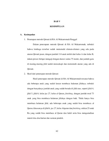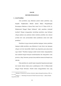 Tujuan Penelitian ini adalah: (1) untuk mengetahui penerapan Metode Qiro’ati dalam pengembangan membaca Al-Qur’an di kelas B di RA Al�Mukarromah Panggel Panjer Kebumen. (2) untuk mengetahui bagaimana hasil evaluasi KBM (Kegiatan Belajar Mengajar dengan Metode Qiro’ati, apakah mampu meningkatkan membaca Al-Qur’an anak-anak RA Al-Mukarromah Panggel Panjer Kebumen. Penelitian ini berupa Penelitian Kualitatif. Anak-anak yang menjadi subjek penelitian yaitu RA kelas B di RA Al-Mukarromah Panggel Panjer Kebumen. Peneliti menggunakan metode kualitatif untuk mendapatkan hasil penelitian dalam prosesnya. Data-data yang terkumpul diperoleh dari rangkaian proses pengamatan atau observasi langsung di dalam pembelajaran, kemudian peneliti melakukan wawancara dengan pihak sekolah, ustadz-ustadzah TPQ, Kepala Sekolah, serta kepala TPQ. Peneliti menggunakan analisis data kualitatif untuk mengkaji semua informasi yang berhasil dikumpulkan, berupa reduksi data, kemudian peneliti melakukan penyajian data, lalu penarikan kesimpulan di bagian paling akhir. Dari penelitian yang telah dilakukan dalam kurun waktu Mei-Agustus, dapat ditarik kesimpulan bahwa: (1) praktik Pembelajaran menggunakan metode Qiro’ati di RA Al-Mukarromah Panggel Panjer Kebumen telah terlaksana sesuai prosedur pembelajaran metode Qiro’ati. (2) implementasi Metode Qiro’ati yang ada di kelas RA B dapat meningkatkan baca Al-Qur’an dengan tartil dan benar serta membuat anak-anak mampu memahami materi ghorib dan tajwid secara efisien.