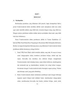Pembinaan akhlak merupakan suatu usaha atau tindakan yang dilakukan oleh seorang guru kepada anak didik dalam rangka mengembangkan akhlak agar anak didik memiliki akhlak yang mulia dan mempunyai kebiasaan yang terpuji. Penelitian ini memfokuskan penelitian tentang Peran Ustadz/ustadzah Taman Pendidikan Al�Qur‟an Nurul Huda Tlogopragoto dalam Pembinaan Akhlak Santri. Rumusan masalah yang dikaji yaitu peran Ustadz/ustadzah TPQ Nurul Huda Tlogopragoto dalam membina akhlak santri, dan metode yang digunakan dalam membina Akhlak. Metodologi penelitian yang penulis gunakan yaitu menggunakan jenis penelitian kualitatif lapangan, Pengumpulan data dalam penelitian ini menggunakan metode observasi , wawancara dan dokumentasi. Informan yang terdapat dalam penelitian ini berjumlah 6 orang Ustadz/ustadzah. Berdasarkan penelitian yang penulis lakukan, penulis dapat menarik kesimpulan bahwa peran Ustadz/ustadzah dalam pembinaan akhlak santri di TPQ Nurul Huda Tlogopragoto sudah berjalan dengan baik yaitu dengan cara memberikan tauladan, membiasakan santri berakhlakul karimah, memberikan nasihat, dan mengkisahkan/cerita untuk memotivasi berakhlakul karimah.