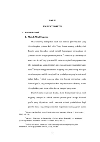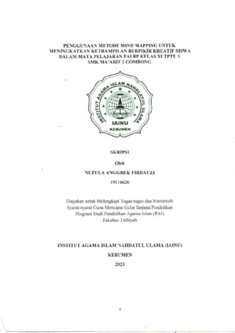 Nuzula Anggrek Firdauzi, NIM.19116626 (2023) Penelitian ini berjudul “Penggunaan Metode Mind Mapping untuk Meningkatkan Ketampilan Berpikir Kreatif Siswa dalam Mata Pelajaran PAI BP Kelas XI TPTU I SMK Ma‟arif 2 Gombong. Diploma thesis, Institut Agama Islam Nahdlatul Ulama ( IAINU) Kebumen.