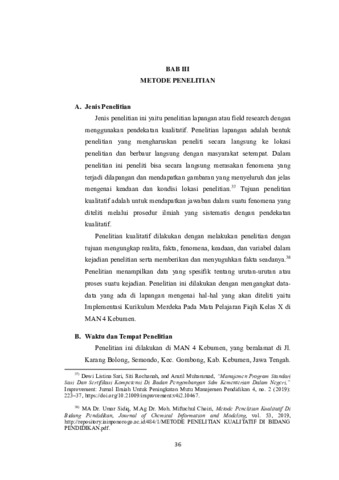 adalah kelas X MAN 4 Kebumen sejumlah tiga kelas yang pada setiap kelasnya terdapat 37 siswa. Metode yang digunakan dalam penelitian ini adalah metode kualitatif menggunakan jenis penelitian lapangan (field research). Teknik