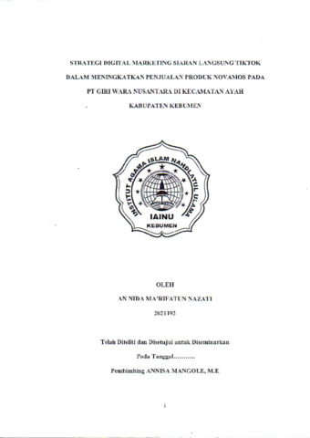 An Nida Marifatun Nazati, NIM.2021192 (2024) Strategi Digital Marketing siaran langsung Tiktok dalam meningkatkan Penjualan Produk Novamos pada PT Giri Wara Nusantara di Kecamatan Ayah kabupaten kebumen. Diploma thesis, Institut Agama Islam Nahdlatul Ulama ( IAINU) Kebumen.
