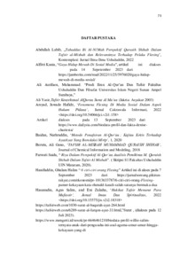 Skripsi ini membahas tentang relevansi surah al-ma’un ayat 6 terhadap fenomena Flexing di sosial media tiktok yang saat ini sedang viral di masyarakat. Fenomena ini muncul seiring dengan banyaknya konten di sosial media tiktok yang memamerkan segala sesuatunya. Misalnya, seseorang pamer tas mewah, saldo rekening,prestasi,jalan-jalan keluar negeri, kegiatan olahraga, pamer kendaraan. Hal ini tentunya sangat meresahkan karena akan menimbulkan rasa iri bagi yang melihatnya dan banyak generasi muda yang menirunya. Padahal telah kita ketahui bahwa Al-Qur’an adalah pedoman bagi seluruh umat islam, baik yang muda ataupun tua. Fenomena ini akan di relevasikan dengan tafsir Al-Misbah surah Al-Ma’un ayat 6 yang melarang berbuat riya’. Penelitian ini bertujuan untuk mengetahui tentang Fenomena Flexing Di Media Sosial (Tiktok) Relevansinya Dengan Tafsir Al – Misbah Surah Al Ma’un Ayat 6 Karya Quraish Shihab. Pokok dari permasalahan dalam penelitian ini di fokuskan pada: (1). Bagaimana penafsiran Quraish Shihab mengenai ayat 6 Surah Al-Ma'un dalam kaitannya dengan fenomena Flexing di Tiktok? (2). Bagaimana dampak penfasiran Quraish Shihab terhadap fenomena Flexing di media sosial Tiktok?. Adapun metode yang penulis gunakan adalah penelitian kualitatif dengan menggunakan metode penelitian library research. Sumber referensi dari penelitian ini adalah buku-buku atau literatur yang memiliki korelasi dengan fenomena Flexing di sosial media tiktok dan kitab Tafsir Al-Misbah atau kitab lainya yang masih bersangkutan. Metode yang digunakan dalam penelitian ini ialah : Metode tematik dengan Teknik analisis data yang meliputi: (1). Menghimpun ayat-ayat yang berkaitan dengan Flexing dalam Al-qur’an. (2). Menyusun ayat-ayat mengenai Flexing dalam Al-Qur’an secara tematik. (3). Memahami korelasi ayat. (4). Memperhatikan asbabun nuzul untuk memahami konteks ayat. (5). Melengkapi pembahasan dengan literatur, buku, artikel, majalah, dan sebagainnya yang berkaitan dengan tema Flexing. (6). Membuat kesimpulan dari masalah yang dibahas. Berdasarkan analisis peneliti Flexing mempunyai dapat negatif dan positif. Dampak positifnya yaitu memotivasi diri,memperluas jaringan membuka peluang kerja, sumber informasi, dan menjadi motivasi. Sedangkan dampak negatifnya yaitu kehidupan orang yang pamer akan semakin konsumtif, rasa empati berkurang, dan sebagainya. Meskipun demikian, lebih banyak dampak negatifnya karena fenomena tersebut sesuai dengan Tafsir Al-Qur’an Surah Al-Ma’un Ayat 6 yang berisi tentang orang-orang yang berbuat riya’ akan celaka. Hal tersebut dikarenakan melakukan sesuatu perbuatan tidak untuk mencari keridhaan Allah, tetapi untuk mencari pujian atau kemasyhuran (ketenaran) di masyarakat.