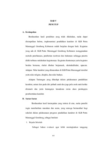 Tujuan penelitian ini yaitu untuk mengetahui 1.) Bagaimana implementasi pendidikan karakter di SLB Putra Manunggal Gombong Kebumen 2.) Apa tantangan yang dihadapi dalam menenkankan pendidikan karakter di SLB Putra
