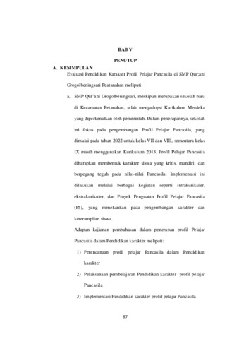 Tujuan penelitian ini adalah 1) Untuk Mengetahui Pendidikan Karakter Profil Pelajar Pancasila di SMP Qur‟ani Grogol Beningsari, Petanahan. 2) Untuk Mengetahui Implementasi Pendidikan Karakter Profil Pelajar Pancasila di SMP Qur‟ani Grogol Beningsari, Petanahan. 3) Untuk Mengetahui Evaluasi Pendidikan Karakter Profil Pelajar Pancasila di SMP Qur‟ani Grogol Beningsari, Petanahan. Penelitian ini berupa Penelitian Kualitatif. Metode yang digunakan dalam penelitian ini adalah Penelitian Lapangan (Field Research). Pengumpulan data dilakukan dari hasil wawancara, observasi dan dokumentasi. Analisis data nyang digunakan adalah analisis data kualitatif. Teknis analisis data yang diguanakan adalah reduksi data, penyajian data dan kesimpulan. Berdasarkan hasil penelitian dapat disimpulkan bahwa : 1) Kurikulum merdeka dalam pendidikan karakter profil pelajar pancasila di SMP Qur‟ani sudah berjalan dengan baik selama 2 tahun. Dalam proses pelaksanaan pendidikan karakter profil pelajar pancasila menggunakan bebrapa prinsip pembelajaran, diantaranya perencanaan, pelaksanaan dan evalusi. 2) Pengimplementasian pendidikan karakter profil pelajar pancasila di SMP Qur‟ani menerapkan nilai-nilai profil pelajar pancasila dalam setiap pembelajaran berlangsung dan kegiatan P5. 3) Dalam evaluasi pendidikan karakter profil pelajar pancasila di SMP Qur‟ani dengan kurikulum merdeka dilakukan dengan dua bentuk assesment formatif dan assesment sumatif.