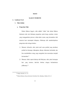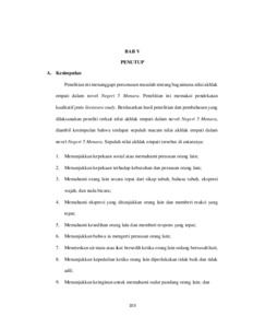 Umi Hoeriyah. 20116938. Nilai Akhlak Empati dalam Novel Negeri 5 Menara. Akhlak menaruh peran yang esensial serta mendasar pada kehidupan manusia yang dijadikan sebagai tema dalam novel. Salah satu novel yang mengandung nilai