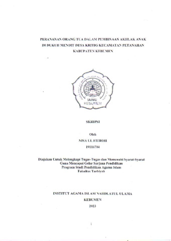 Nisa Ul Fitroh, NIM.19116704 (2023) Perananan Orang Tua Dalam Pembinaan Akhlak Anak Di Dukuh Mendit Desa Kritig Kecamatan Petanahan Kabupaten Kebumen. Diploma thesis, Institut Agama Islam Nahdlatul Ulama ( IAINU) Kebumen.