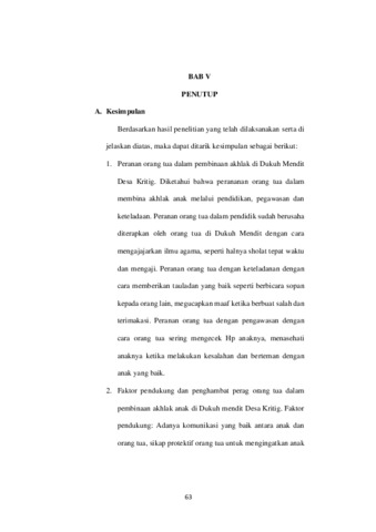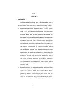 melakukan kesalahan dan berteman dengan anak yang baik. (2). Faktor pendukung dan penghambat perag orang tua dalam pembinaan akhlak anak di Dukuh mendit Desa Kritig. Faktor pendukung: Adanya komunikasi yang baik antara anak dan