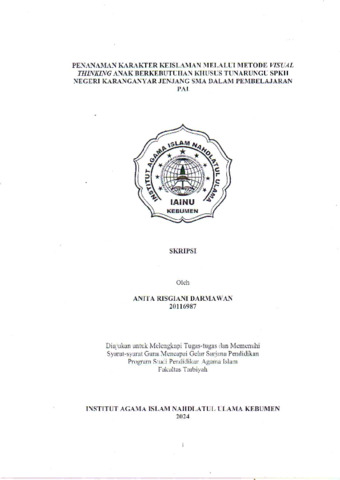 Anita Risgiani Darmawan, NIM. 20116987 (2024) Penanaman Karakter Keislaman melalui Metode Visual Thinking Anak Berkebutuhan Khusus Tunarungu SPKH Negeri Karanganyar jenjang SMA dalam Pembelajaran PAI. Other thesis, Institut Agama Islam Nahdlatul Ulama ( IAINU Kebumen).