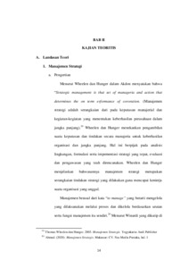 solusinya. Dalam mengkaji persoalan strategi, penelitian ini menggunakan pendekatan manajemen stratejik Wheelen-Hunger. Penelitian ersifat kualitatif dengan teknik engumpulan data dalam penelitian ini yaitu dengan wawancara, observasi, dan dokumentasi. Teknik analisis data yang digunakan dengan