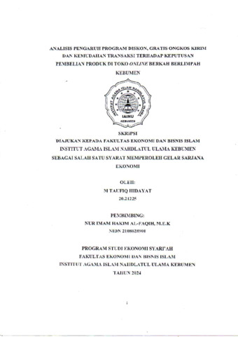 M. Taufiq Hidayat, NIM.2021225 (2024) Analisis Pengaruh Program Diskon, Gratis Ongkos Kirim, dan Kemudahan Transaksi terhadap Keputusan Pembelian Produk di Toko Online Berkah Berlimpah Kebumen. Diploma thesis, IAINU Kebumen.