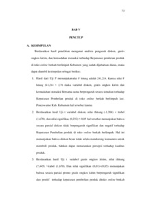 digunakan dalam penelitian ini adalah Teknik analisis kuantitatif. Hasil penelitian menunjukkan bahwa program diskon tidak berpengaruh signifikan dan bahkan berpengaruh negatif terhadap keputusan pembelian produk di toko online Berkah Berlimpah dengan nilai thitung (-1,204) < ttabel (1,670). dan nilai signifikaa (0,232) > 0,05. Sebaliknya, gratis ongkos kirim memiliki nilai thitung (7,445) >ttabel (1,670). dan nilai signifikan (0,01)<(0,05) dan kemudahan