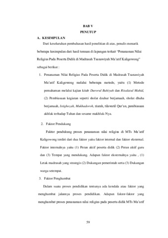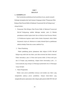 peserta didik yang religius, berakhlak mulia dan berkompeten. (3) Faktor pendukung dalam proses penanaman nilai religius di Madrasah Tsanawiyah Ma‟arif Kaligowong yakni peran aktif peserta didik, peran aktif guru, dan adanya dukungan penuh dari yayasan serta warga setempat.