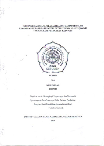 Nur Faidah, NIM.20117010 (2024) Internalisasi Nilai-nilai Akhlakul Karimah Dalam Kehidupan Sehari-hari Santri Putri Pondok Pesantren Al-Istiqomah Tanjungsari Petanahan Kebumen. Diploma thesis, IAINU Kebumen.