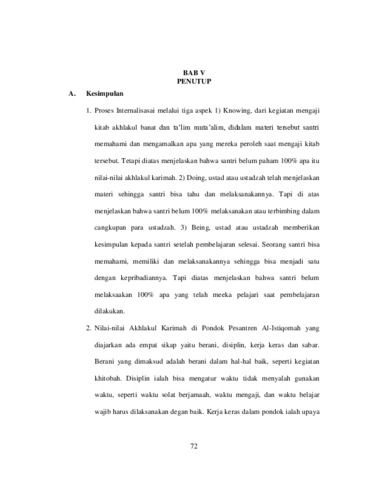Tanjungsari Petanahan Kebumen (3) Mengetahui Faktor pendukung dan penghambat dalam Internalisasi Nilai-Nilai Akhlakul Karimah Dalam Kehidupan Sehari-hari Santri Putri Pondok Al-Istiqomah Tanjungsari Petanahan Kebumen. Teknik pengumpulan data yang digunakan adalah wawancara, observasi dan dokumentasi. Teknik analisis yang digunakan adalah reduksi data, penyajian data dan verifikasi data. Hasil penelitian ini adalah (1) Proses internalisasi nilai-nilai akhlakul karimah dalam kehidupan sehari-hari santri putri Pondok Al-Istiqomah Tanjungsari Petanahan Kebumen ada tiga aspek yaitu Knowing dari kegiatan mengaji kitab akhlakul banat dan ta‟lim muta‟alim, didalam materi tersebut