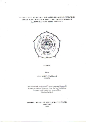 Anis Nurul Karimah, NIM.18116535 (2022) Internalisasi Nilai-nilai Karakter Religius dan Mandiri Santri Putri di Pondok Pesantren Husnul Hidayah Karang Tanjung. Diploma thesis, Institut Agama Islam Nahdlatul Ulama ( IAINU) Kebumen.