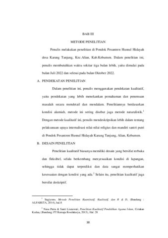 internalisasi nilai karakter religius dan mandiri santri putri di pondok pesantren Husnul Hidayah Karang Tanjung, Alian, Kebumen. Penelitian ini berupa penelitian kualitatif. Santri yang diteliti adalah santri putri di pondok pesantren Husnul Hidayah. Metode yang digunakan dalam penelitian ini adalah metode kualitatif. Data yang dikumpulkan berupa data