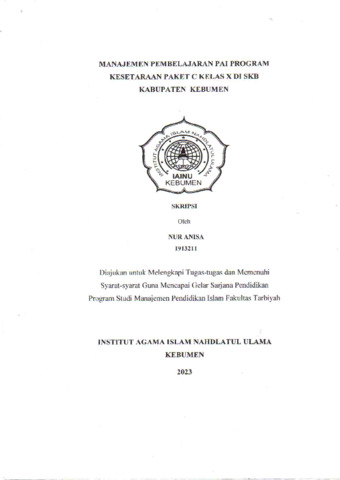Nur Anisa, NIM.1913211 (2023) MANAJEMEN PEMBELAJARAN PAI PROGRAM KESETARAAN PAKET C KELAS X DI SKB KABUPATEN KEBUMEN. Diploma thesis, Institut Agama Islam Nahdlatul Ulama ( IAINU) Kebumen.