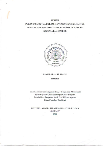 Tanzilal Alfi Rohmi, NIM.18116528 (2022) Peran Orang Tua dalam Menumbuhkan Karakter Disiplin dalam Pembelajaran di SD N 1 Kenteng Kecamatan Sempor. Diploma thesis, Institut Agama Islam Nahdlatul Ulama ( IAINU) Kebumen.