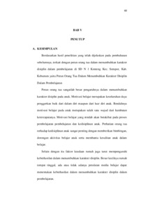 pembimbing. Faktor pendukung (1) tingkat ekonomi orang tua. (2) latar belakang pendidikan orang tua. Sedangkan faktor pengahambatnya yaitu gadget dan minimnya pengetahuan orang tua tentang pentingnya karakter disiplin. Rekomendasi untuk sekolah sebagai lembaga pendidikan penting sekali