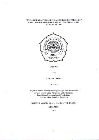 Zaky Ibtahaj, NIM.18116813 (2023) Pengaruh Kompetensi Pedagogik Guru Terhadap Prestasi Belajar Fiqih Kelas IV DI MI Ma’arif Karanganyar. Diploma thesis, Institut Agama Islam Nahdlatul Ulama ( IAINU) Kebumen.