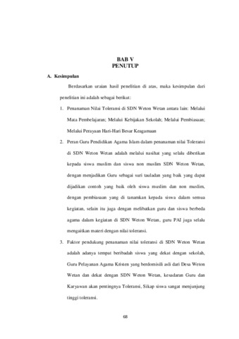 berbeda agama dalam kegiatan; (3) Faktor pendukung penanaman nilai toleransi di SDN Weton Wetan adalah adanya tempat beribadah siswa yang dekat dengan sekolah; Guru Pelayanan Agama Kristen yang berdomisili asli dari Desa Weton