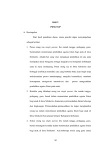 Saiful Hamzah : Peran Orang Tua Dalam Menentukan Pendidikan Agama Islam Bagi Anak di Desa Selokerto, Kecamatan Sempor, Kabupaten Kebumen. Tujuan penelitian: 1) Untuk mengetahui peran orang tua single parent, ibu rumah tangga, pedagang, guru, buruh dalam menentukan pendidikan agama Islam bagi anak di Desa Selokerto. 2)Untuk mengetahui kendala yang dihadapi orang tua single parent, ibu rumah tangga, pedagang, guru, buruh dalam menentukan pendidikan agama Islam bagi anak di Desa Selokerto. 3) Untuk mengetahui solusi orang tua single parent, ibu rumah tangga, pedagang, guru, buruh menangani kendala dalam menentukan pendidikan agama Islam bagi anak di Desa Selokerto. Penelitian ini menggunakan pendekatan kualitatif, orang tua yang di teliti diambil beberapa sampel yang memiliki anak usia sekolah dasar di Desa Selokerto. Penelitian ini menggunakan metode penelitian induktif, data yang dikumpulkan meliputi observasi, hasil wawancara dan dokumentasi. Analisis data dalam penelitian ini menggunakan analisis deskriptif kualitatif dengan instrument analisis induktif.