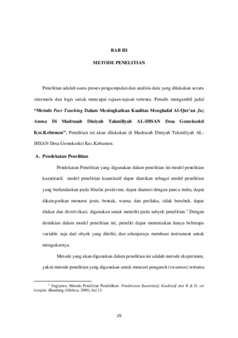 untuk mengetahui apakah penerapan Metode Peer Teaching dapat meningkatkan kualitas menghafal Al-Qur’an Juz Amma santri. Indikator kualitas menghafal Al-Qur’an dalam penelitian ini adalah hafalan atau tahfidz, tajwid, kefasihan, dan adab.