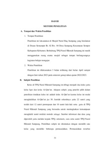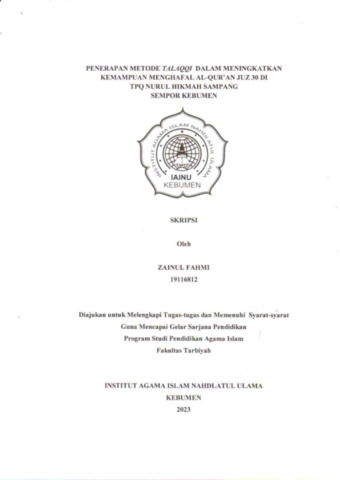 Zainul Fahmi, 19116812 (2023) Penerapan Metode Talaqqi dalam Meningkatkan Kemampuan Menghafal Al-Qur‟an Juz 30 di TPQ Nurul Hikmah Sampang Sempor Kebumen. Other thesis, IAINU Kebumen.
