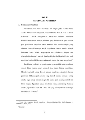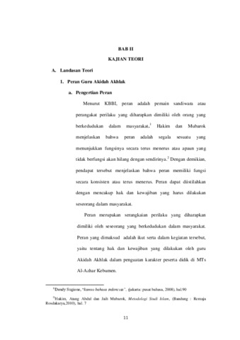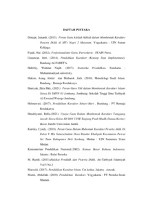 Tujuan Penelitian dari penelitian ini adalah untuk mengetahui : (1) Peran guru Akidah Akhlak dalam penguatan karakter peserta didik kelas VIII di MTsAl-Azhar Kebumen . (2) Karakter yang diterapkan pada peserta didik kelas VIII diMTs Al-Azhar Kebumen. Metode yang digunakan dengan pendekatan kualitatif. Adapun desainpenelitiannya adalah deskriptif . Data diperoleh dari hasil observasi, wawancaradan dokumentasi. Dan untuk analisis data penulisan menggunakan analisis dariMilles & Huberman Teknik pengolahan data menggunakan analisis kualitatif yangmeliputi reduksi data, penyajian data dan penarikan kesimpulan. Berdasarkan hasil penelitian dapat disimpulkan bahwa: (1) Peran guru akidah akhlak yang diterapkan kepada peserta didik kelas VIII di MTs Al-Azhar yaitu peran guru sebagai pengajar, peran guru sebagai pembimbing, peran gurusebagai model atau teladan, peran guru sebagai penasehat, dan peran guru sebagaimotivator.(2) Karakter yang sudah diterapkan guru akidah akhlak kepada pesertadidik di MTs al-Azhar sebagai penguatan karakter meliputi Religius, Disiplin,Jujur, dan Tanggung Jawab.