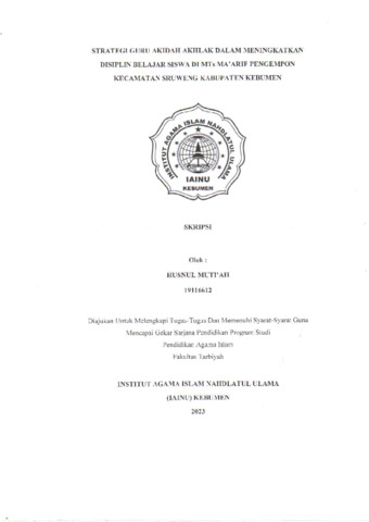 Husnul Mutiah, NIM. 19116612 (2023) Strategi Guru Aqidah Akhlak Dalam Meningkatkan Disiplin Belajar Siswa di MTs Ma‟arif Pengempon Kecamatan Sruweng Kabupaten Kebumen. Diploma thesis, Institut Agama Islam Nahdlatul Ulama ( IAINU) Kebumen.