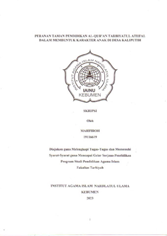 Mahfiroh, NIM.19116619 and Dr. Benny Kurniawan, M.Pd.I, . (2023) Peranan Taman Pendidikan Al-Qur’an Tarbiyatul Athfal dalam Membentuk Karakter Anak di Desa Kaliputih. Diploma thesis, Institut Agama Islam Nahdlatul Ulama ( IAINU) Kebumen.