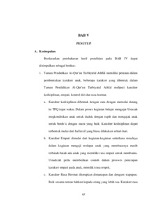 Mahfiroh (19116619) : Peranan Taman Pendidikan Al-Qur’an Tarbiyatul Athfal dalam Membentuk Karakter Anak di Desa Kaliputih. Tujuan penelitian ini : (1) untuk mengetahui peranan Taman Pendidikan AlQur’an Tarbiyatul Athfal dalam membentuk karakter pada anak; (2) untuk mengetahui kendala yang dihadapi oleh Taman Pendidikan Al-Qur’an Tarbiyatul