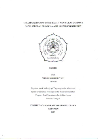 WIWIT NUR HIDAYATI, NIM.1913191 (2023) Strategi Branding Image dalam Meningkatkan Daya Saing Sekolah SMK Ma’arif 2 Gombong Kebumen. Diploma thesis, Institut Agama Islam Nahdlatul Ulama ( IAINU) Kebumen.