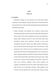 Penelitian ini bertujuan untuk menganalisis strategi komunikasi pemasaran pada Surty Collection Sruweng dalam meningkatkan penjualan ditinjau dari etika bisnis Islam. Penelitian ini dilatar belakangi akibat adanya penurunan produk karena kurangnya strategi yang digunakan dalam pemasarannya. Penelitian ini menggunakan pendekatan kualitatif dengan teknik pengumpulan data menggunakan wawancara, observasi dengan dokumen dari beberapa sumber dan dokumentasi. Hasil dari penelitian ini menunjukkan bahwa strategi komunikasi pemasaran pada Surty Collection dalam meningkatkan penjualan menggunakan 5 tahap strategi komunikasi yaitu: penelitian, perencanan, pelaksanaan, evaluasi dan pelaporan. Surty Collection Sruweng melakukan penelitian pasar dahulu, melakukan studi banding keluar untuk suplay harga, melakukan promosi dan penyuluhan, tetapi pada tahapan ini proses penyuluhan terhenti karena kekurangan sumber daya manusianya, melakukan evaluasi setiap terjadinya suatu compline dari pihak konsumen, adanya tindakan dalam suatu kegiatan yaitu pelaporan pada akhir bulan. Surty Collection dalam meningkatkan penjualan ditinjau dari etika bisnis Islam menggunakan 5 prinsip yaitu: kesatuan, adil, kehendak bebas, tanggung jawab dan bermanfaat. Meskipun pada prakteknya, penerapan prinsip-prinsip etika bisnis Islam di Surty Collection masih ada yang belum sempurna