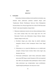 penutup (e) evaluasi (post-test) (2) Setelah dilaksanakan pembelajaran dengan menggunakan metode sariswara, kosakata bahasa Jawa krama inggil yang dimiliki siswa mengalami peningkatan. Hal ini dilihat dari nilai post-test yang mengalami peningkatan, pada pre-test nilai rata-rata kelas adalah 24,5 dan pada post-test nilai rata-rata siswa adalah 70,1