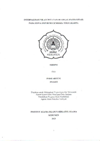 Indri Aryuni, 19116692 and Nadia Raifah Nawa Kartika, M.Pd, 2122019103 (2023) Internalisasi Nilai Cinta Tanah Air (Al-Wathaniyah) pada Siswa SMP Bumi Cendekia Yogyakarta. Other thesis, IAINU Kebumen.