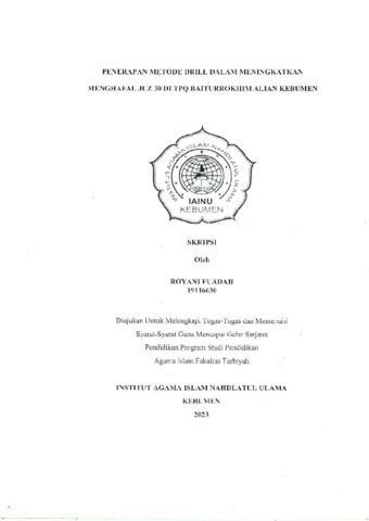 Royani Fuadah, NIM.19116630 and Nihayatul Husna, L.c.,M.Hum, . (2023) Penerapan Metode Drill dalam Meningkatkan Menghafal Juz 30 di TPQ Baiturrokhim Alian Kebumen. Diploma thesis, Institut Agama Islam Nahdlatul Ulama ( IAINU) Kebumen.