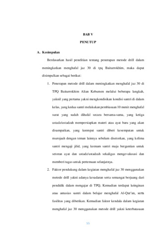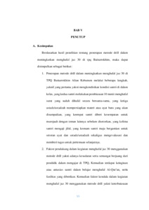 memudahkan santri dalam menghafal serta meningkatkan hafalan para santri. 2) Terdapat faktor kendala dalam menerapkan metode drill dalam menghafal di TPQ Baiturrokhim, yaitu; a) kendala waktu, b) ketidak disiplinan santri, c) Perbedaan