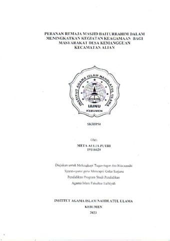 Meta Aulia Putri, NIM.19116620 and Abdul Waid, M.S.I, . (2023) Peranan Remaja Masjid dalam Meningkatkan Kegiatan Keagamaan bagi Masyarakat Desa Kemangguan Kecamatan Alian. Diploma thesis, Institut Agama Islam Nahdlatul Ulama ( IAINU) Kebumen.