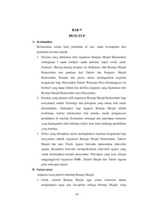 dengan beberapa aspek yang dilakukan oleh organisasi RMB yakni aspek spiritual, aspek sosial dan aspek finansial. Adapun kendalanya dalam meningkatkan kegiatan keagamaan bagi masyarakat adalah teknologi, pekerjaan, kesibukan anggota remaja masjid, semangat dan partisipasi yang menurun.
