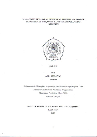 Abdi Setiawan, NIM.1913165 and Agus Nur Soleh,M.Pd, . (2023) Manajemen Pemasaran Pendidikan Tim Media di Pondok Pesantren Al-Istiqomah Tanjungsari Petanahan Kebumen. Diploma thesis, Institut Agama Islam Nahdlatul Ulama ( IAINU) Kebumen.