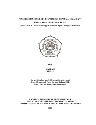 Mardam, NIM.1922115 and Abdul Waid,S.H.I., M.S.I, . (2023) Penyelesaian Sengketa Tanah Hibah Kepada Anak Angkat dalam Tinjauan Hukum Islam (Studi Kasus di Desa Candirenggo Kecamatan Ayah Kabupaten Kebumen). Diploma thesis, Institut Agama Islam Nahdlatul Ulama ( IAINU) Kebumen.