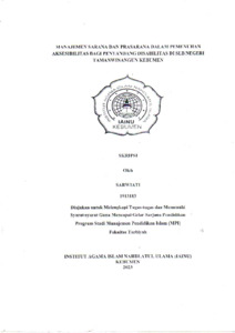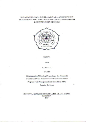 Sarwiati, NIM.1913183 and Bahrun Ali Murtopo, M.Pd.I, . (2023) Manajemen Sarana dan Prasaran dalam Pemenuhan Aksesibilitas bagi Penyandang Disabilitas di SLB Negeri Tamanwinangun Kebumen. Diploma thesis, Institut Agama Islam Nahdlatul Ulama ( IAINU) Kebumen.